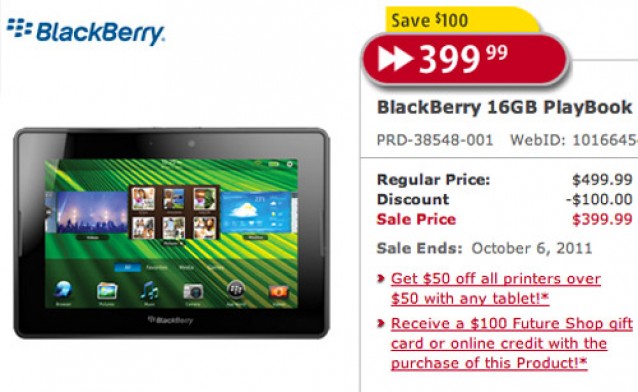 Canadian Best Buy, Future Shop and Staples stores have all knocked a whopping $200 off the PlayBook’s price tag, with the device now selling for just $300. Best Buy and Future Shop are supplying gift cards to take advantage of that $300 price in-store, but all three retailers have reduced the device to $300 online.
